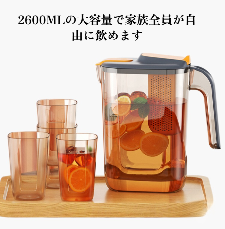 大容量設計で家族やパーティーに最適。耐熱ガラス素材、冷水・熱湯両用。シンプルな日式デザインで食卓を彩る。茶こし付きでお茶作りも便利。